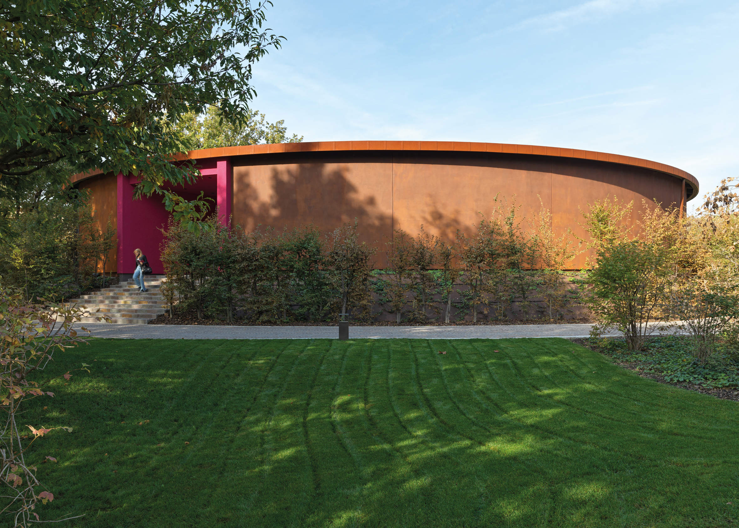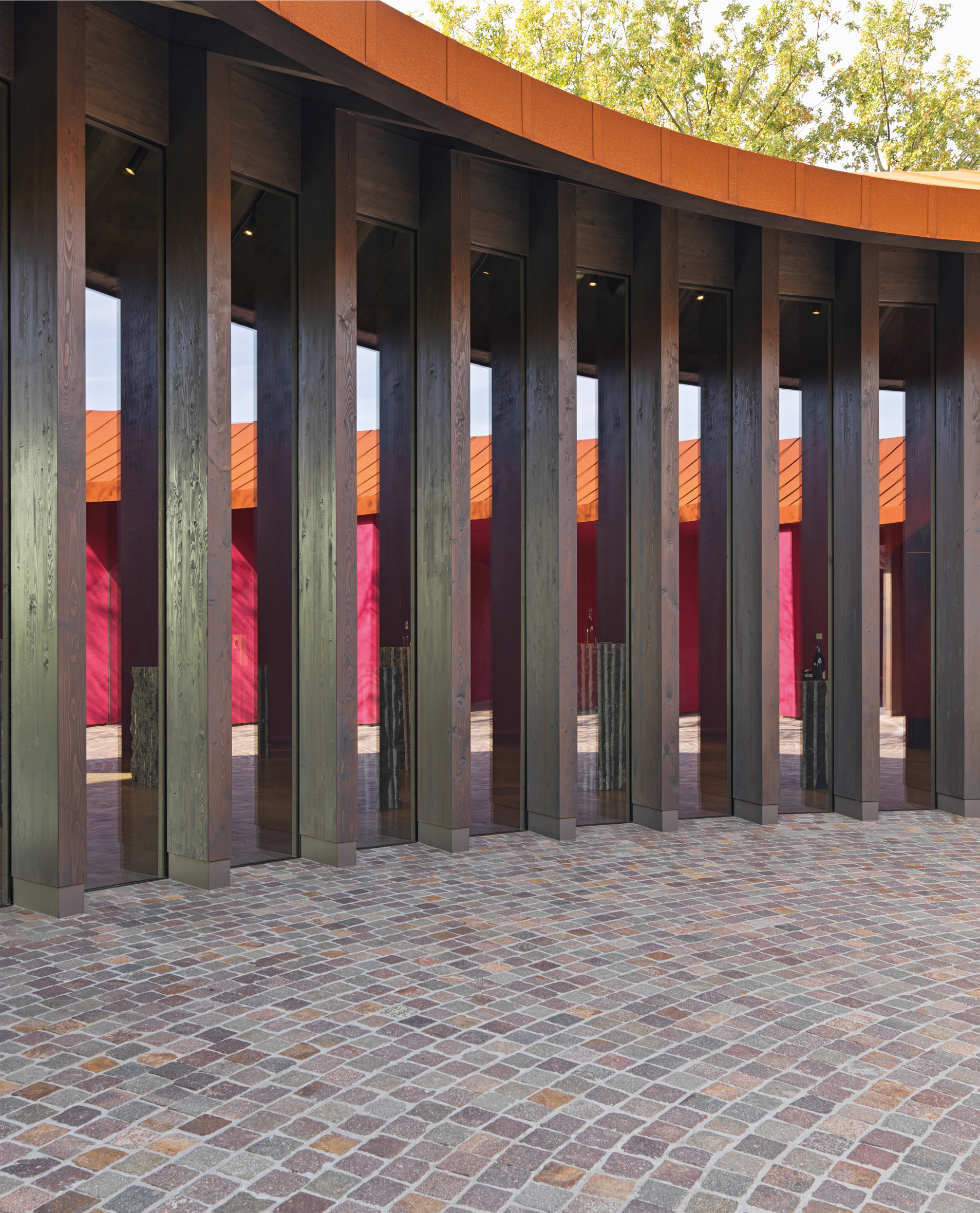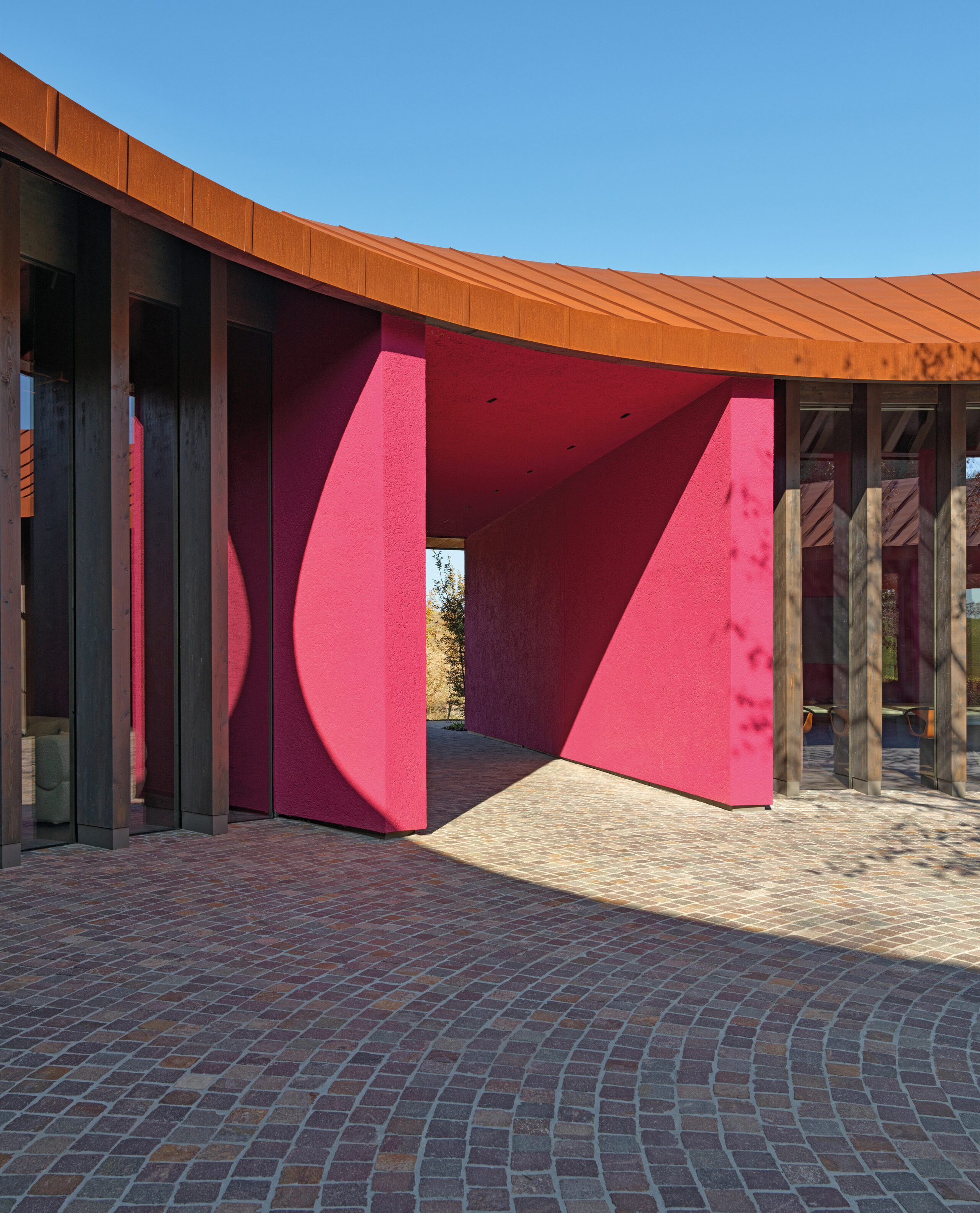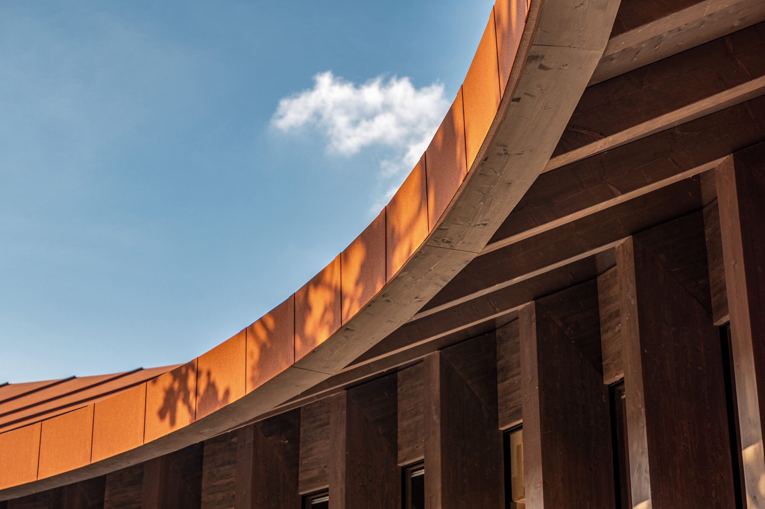Die starke architektonische Identität zeigt sich in einer zeitlosen geometrischen Form, die sowohl an klassische als auch an futuristische Bauten erinnert: eine Reminiszenz an ein Gebäude aus der Römerzeit mit seinem Impluvium (Wasserbecken im römischen Atrium) oder an ein rundes Flugobjekt, das gerade auf dem Gelände gelandet ist. Das große runde Holzdach, das außen mit Corten-Stahl verkleidet ist und Gemeinschaftsräume, Ausstellungsräume und Verkostungsräume sowie überdachte Durchgangsbereiche miteinander verbindet, verleiht dem Gebäude eine eigene Identität. Ein neues Bauwerk mit starkem Charakter und einem nachhaltigen, flexiblen Design, das das Geschehen in der Gegend und die Ergebnisse, die es hervorbringt, auf großartige Weise repräsentieren soll, mit dem Ziel, sich harmonisch in diese Orte einzufügen und zu neuem Leben und neuer Inspiration beizutragen.