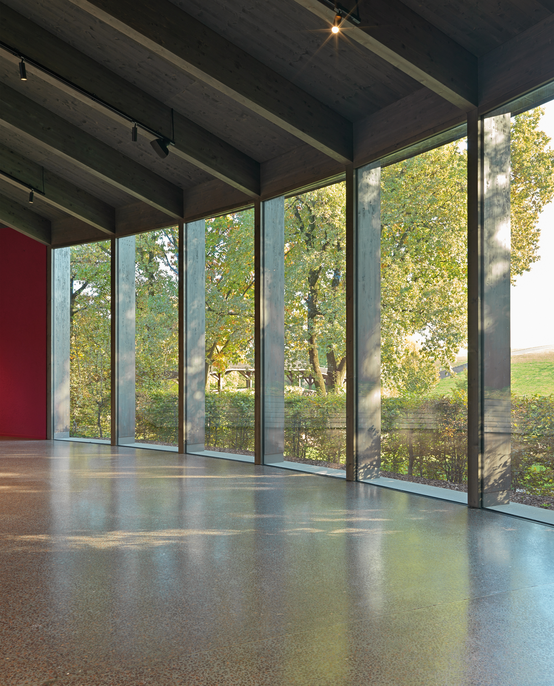 Hohe Portale aus Brettschichtholz gliedern rhythmisch den Raum, ein geschwungenes Kirchenschiff mit einer asymmetrischen doppelten Neigung, das Ergebnis eines architektonischen Konzepts, das die natürliche Verbindung zwischen den Gemeinschaftsräumen mit Blick auf den runden Innenhof betont. Dies ist ein Ort der Begegnung und der Ankunft, der von der Außenwelt abgeschirmt, aber mit ihr verbunden ist.