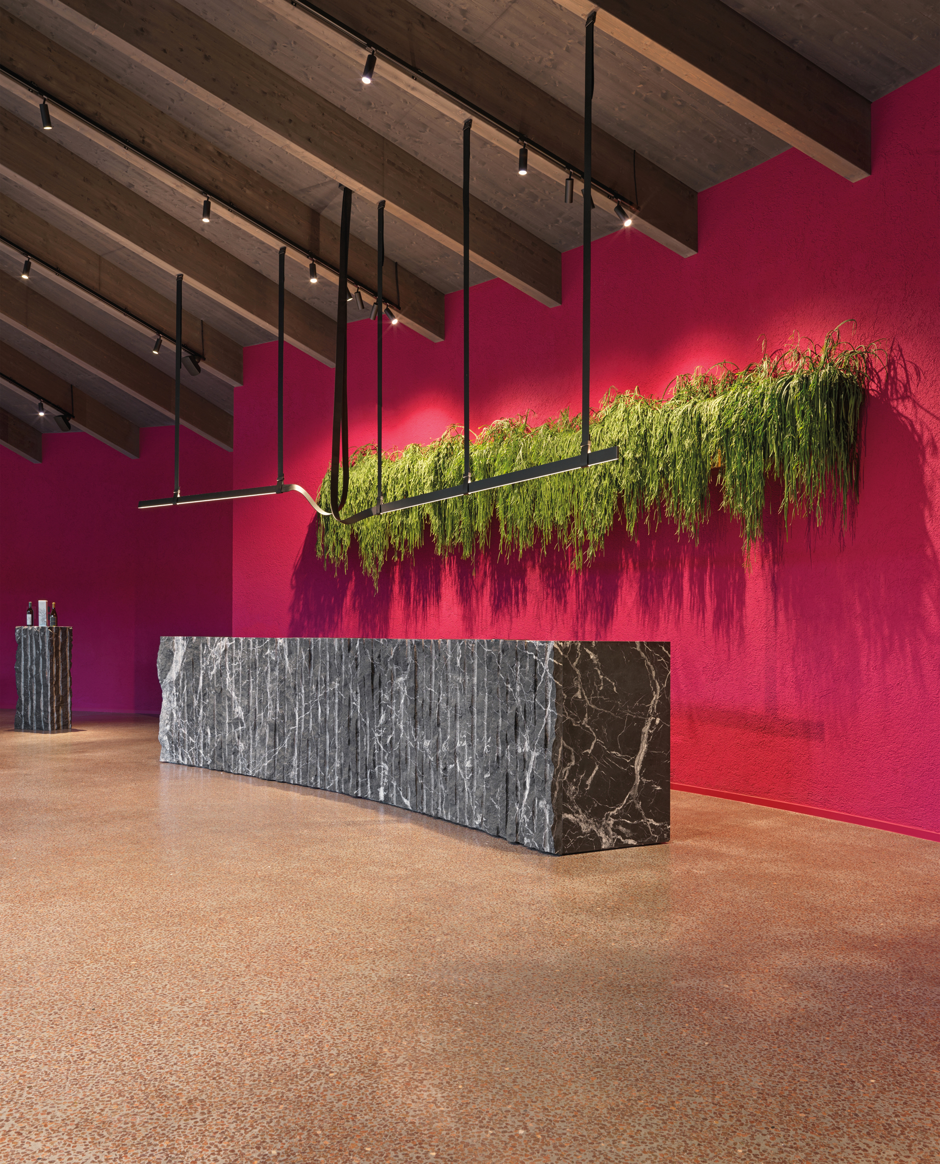 Der neue Empfang spielt eine grundlegende Rolle bei der Präsentation des Unternehmens gegenüber den Besucher:innen. Er ist der erste Raum, der sie empfängt, informiert und die Werte des Territoriums und der hier durchgeführten Produktion vermittelt.