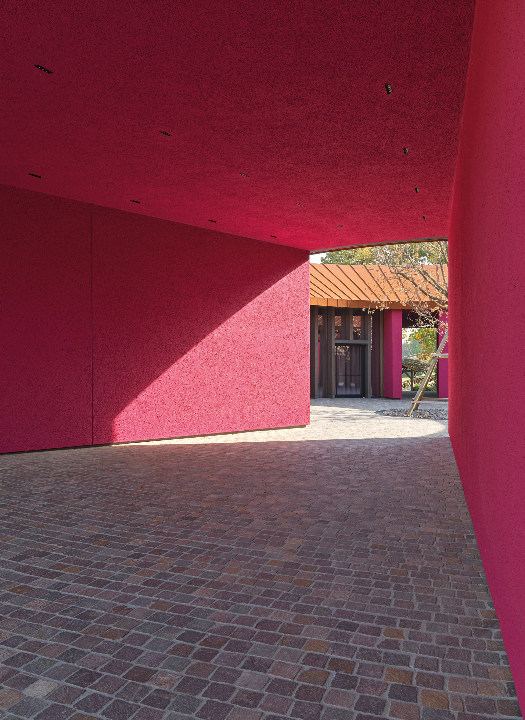 Das Weingut ist bekannt für die untrennbare Verbindung von Wein und Kunst und für ein Produkt von absoluter Qualität. Die Kellerei ist in ihrer Architektur als das harmonische Ergebnis dieser unausweichlichen Berufung zu betrachten. Inspiriert von dieser Ausrichtung auf eine ikonische, qualitativ hochwertige Architektur, zeichnet sich der architektonische Entwurf des neuen Empfangsgebäudes durch seine symbolische, kreisförmige Ringform aus: Es wurde auf einem Parkplatz mit der gleichen Geometrie errichtet und hat eine Eiche in seinem Zentrum. Dies ist eine explizite Metapher, die die eigentliche Absicht des Projekts unterstreicht, nämlich die Natur des Standorts und dessen zentrale Bedeutung für das neue Gebäude zu respektieren.