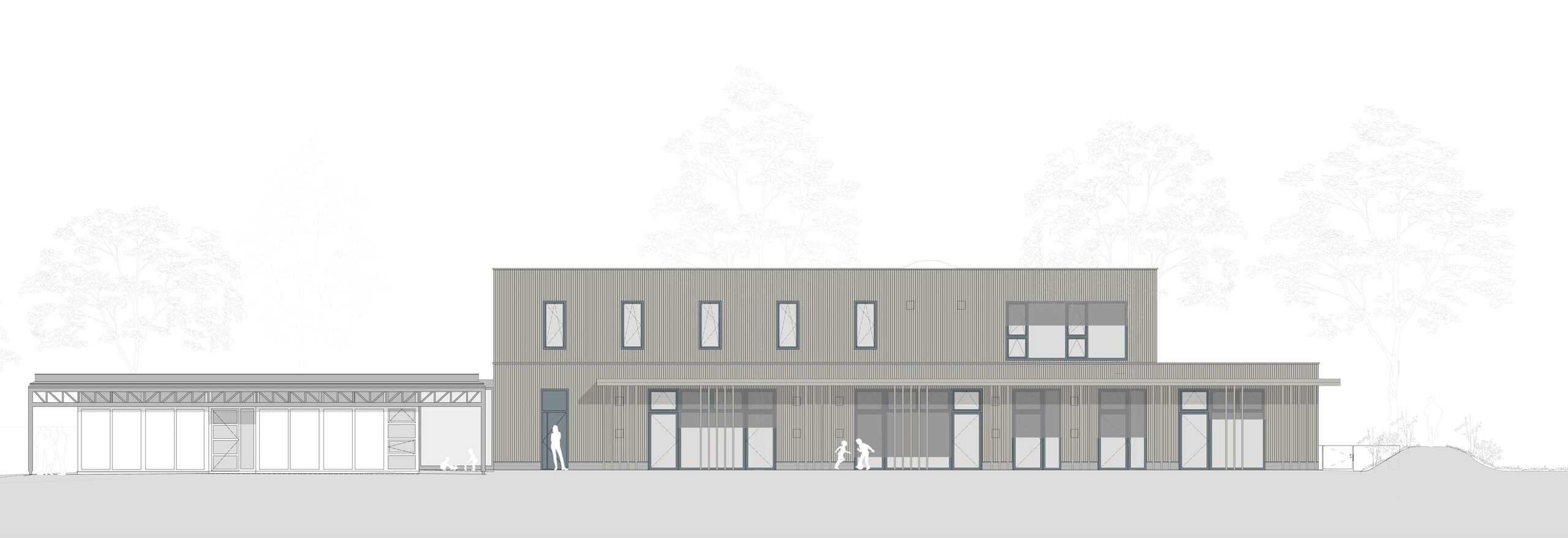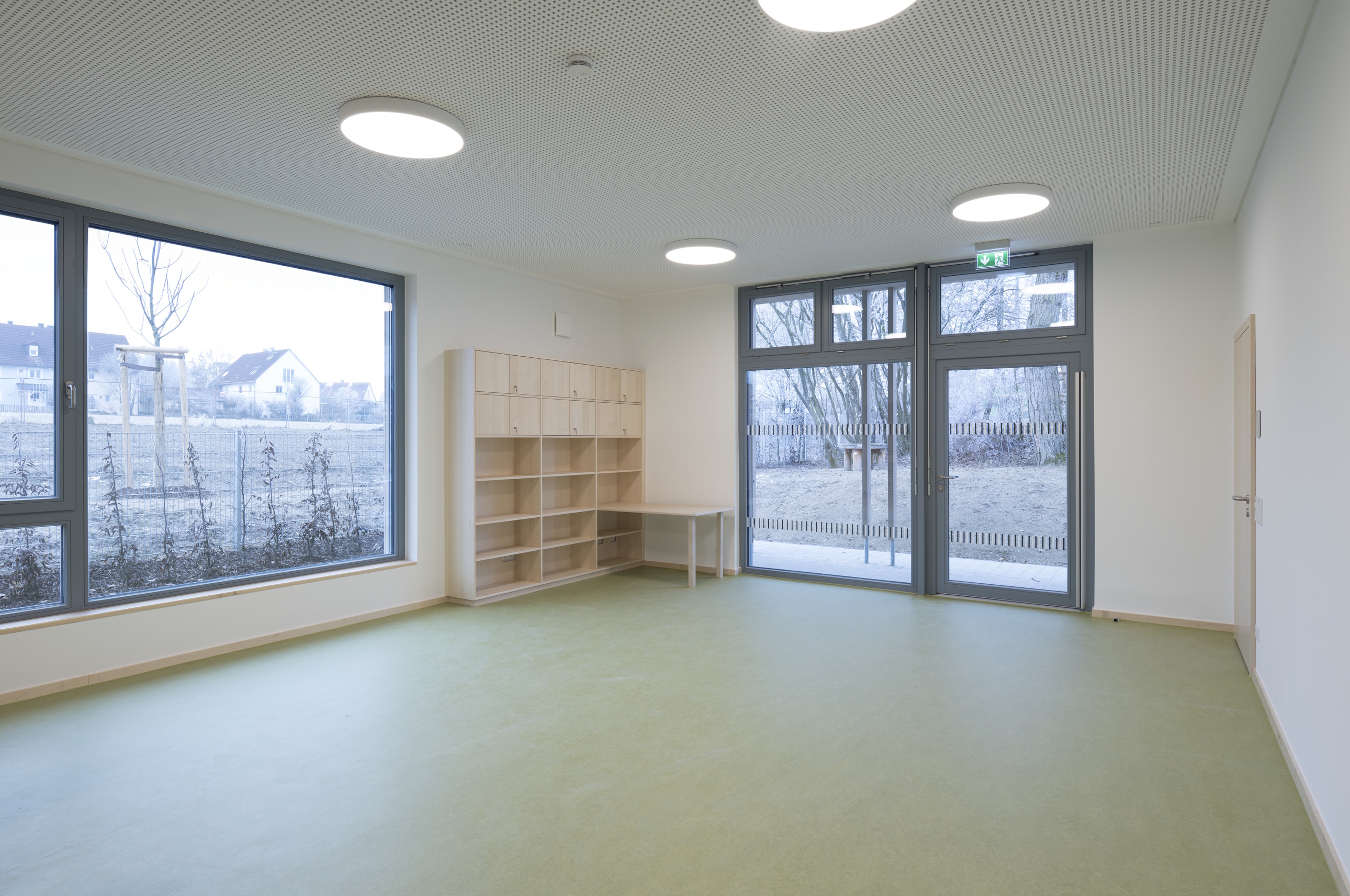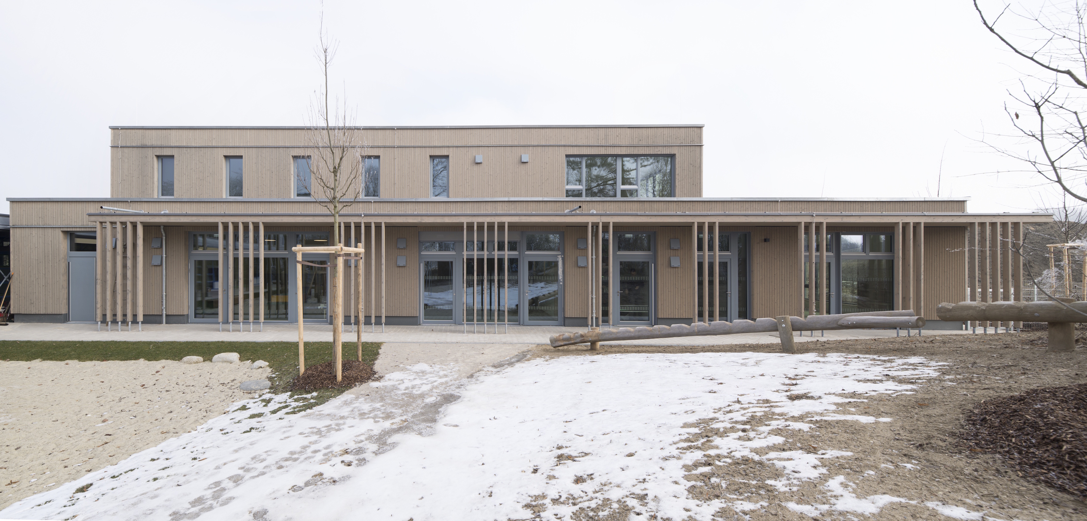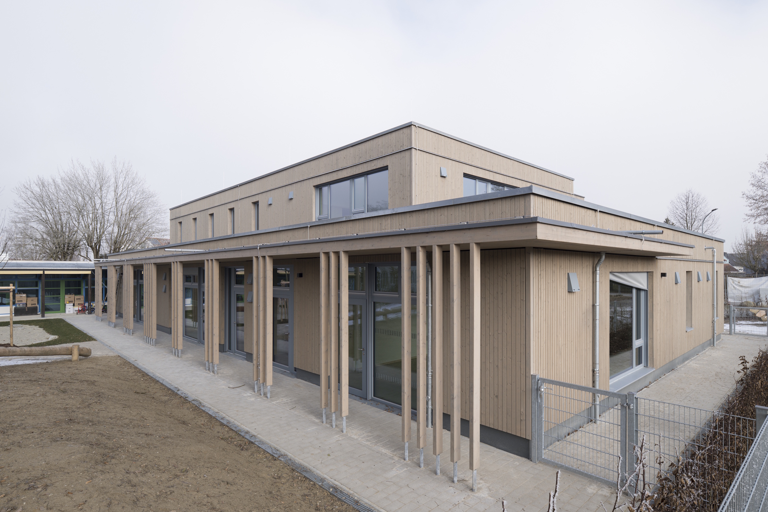 Das 50 Jahre alte, denkmalgeschützte Bestandsgebäude wurde saniert und durch einen Anbau mit tragender Struktur aus Holz ergänzt. Der Neubau ist im 90°-Winkel zum Bestandsgebäude angeordnet. Im Erdgeschoss stehen zwei Gruppenräume, ein Speiseraum, eine Verteilerküche und die notwendigen Nebenräume zur Verfügung, im Obergeschoss ein Mehrzweckraum, Personal- und Therapieräume sowie Nebenräume. Dank der Erweiterung stehen den Kindern der Gemeinde Erdweg insgesamt vier Kindergartengruppen zur Verfügung.