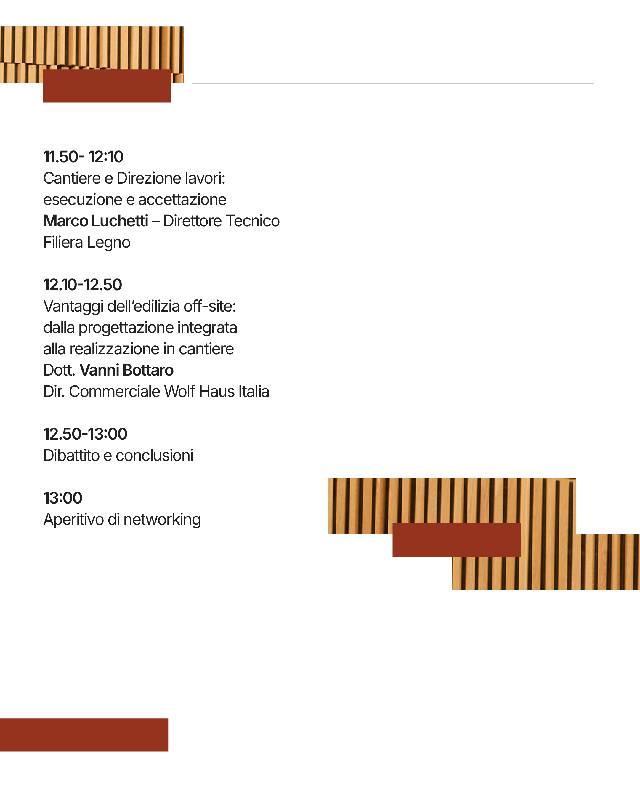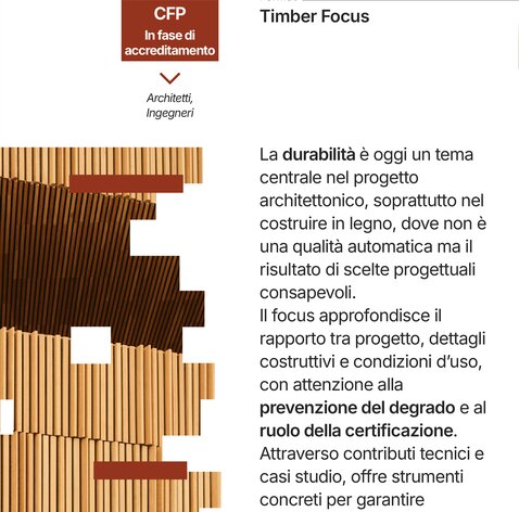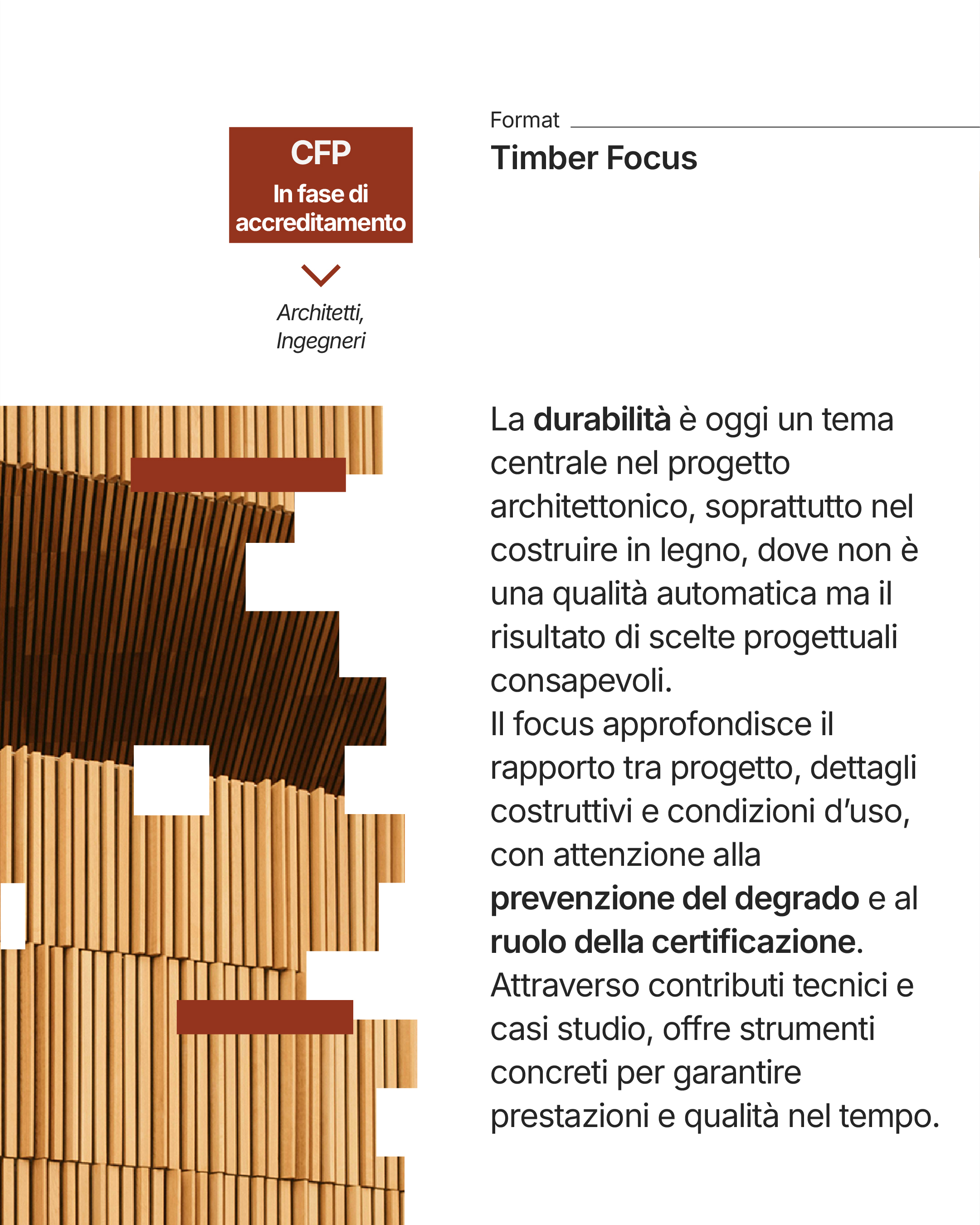 Nel costruire in legno, la durabilità non è una qualità automatica, ma il risultato di un sistema articolato che coinvolge progettazione, dettagli costruttivi, scelta dei materiali, gestione dei nodi e controllo del processo. È nella fase progettuale che si definiscono le condizioni per garantire affidabilità, prestazioni e qualità lungo l’intero ciclo di vita dell’edificio.Il focus tecnico propone un approfondimento sul tema della durabilità nelle costruzioni in legno, mettendo in relazione principi progettuali, soluzioni costruttive e approcci operativi. Particolare attenzione sarà dedicata al rapporto tra progetto e condizioni d’uso, alla prevenzione dei fenomeni di degrado e al ruolo della certificazione come strumento di controllo e garanzia.