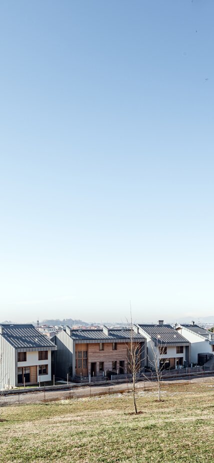 Il Parco dei Gelsi è un insediamento residenziale di iniziativa privata che nasce dalla volontà di realizzare un comparto abitativo a basso impatto ambientale. Il complesso si inserisce in un contesto naturale particolare, un pendio con forte dislivello che ha imposto la realizzazione di un basamento in calcestruzzo integrato nella montagna e con i locali di servizio, su cui sono stati innestati i tre piani fuori terra in legno.