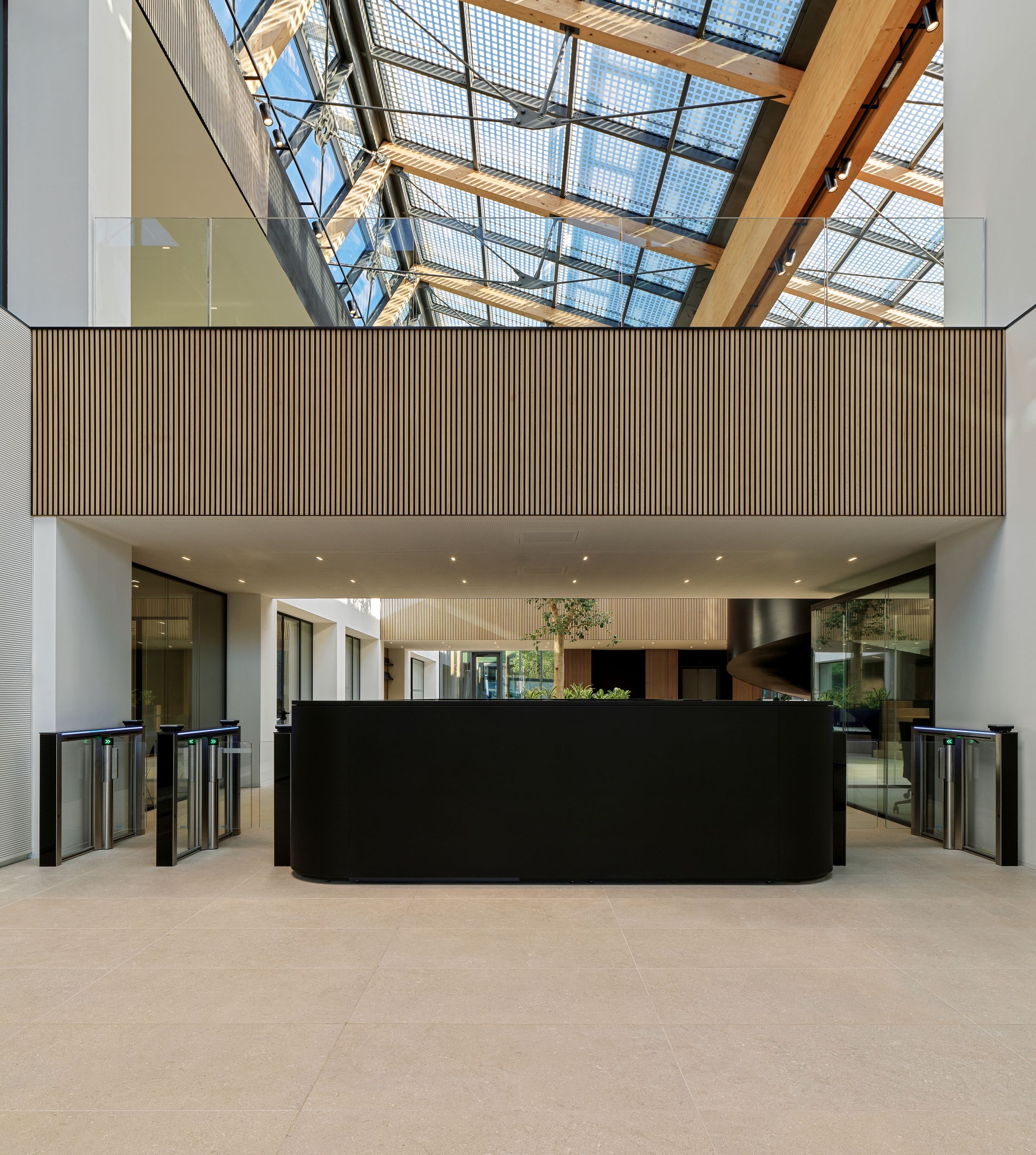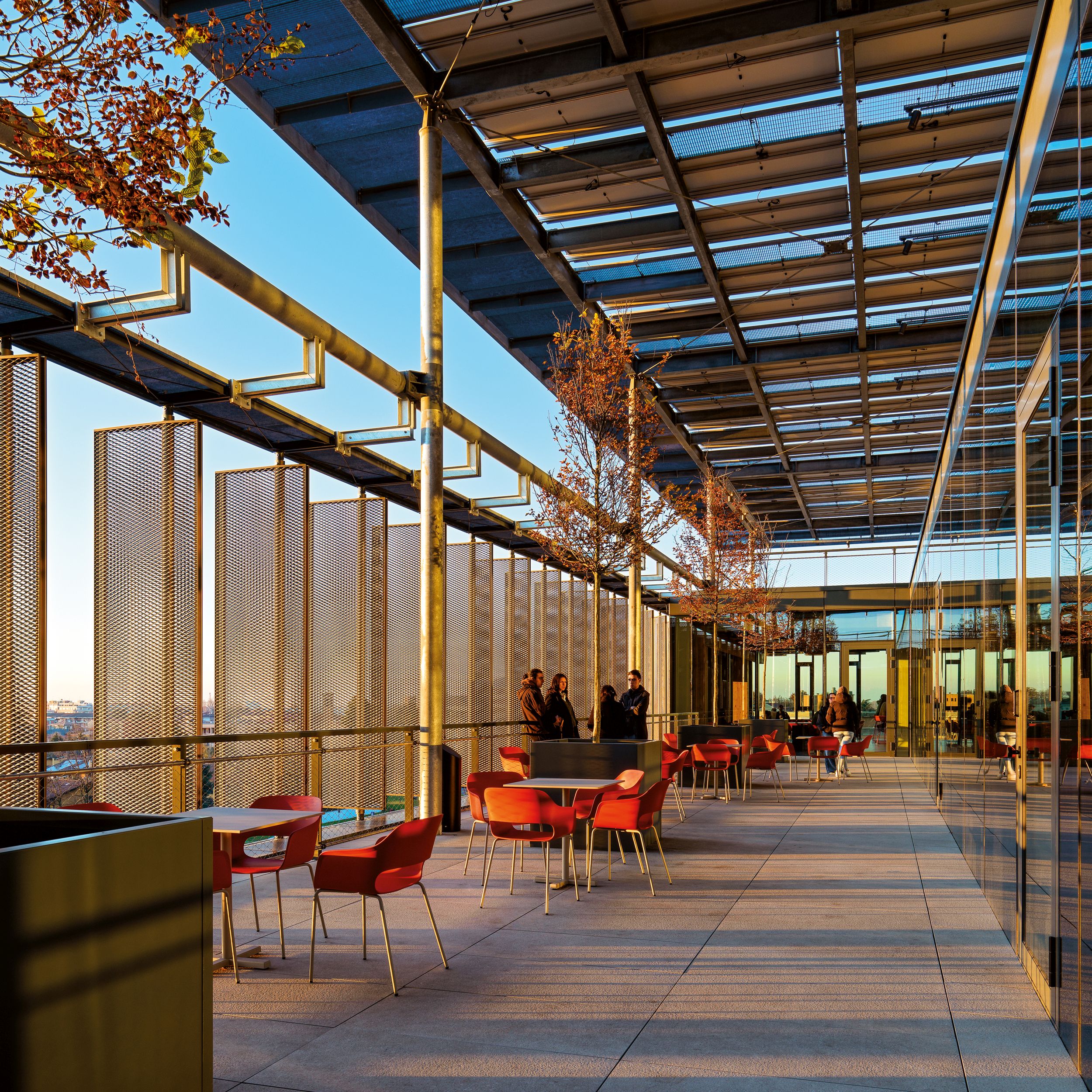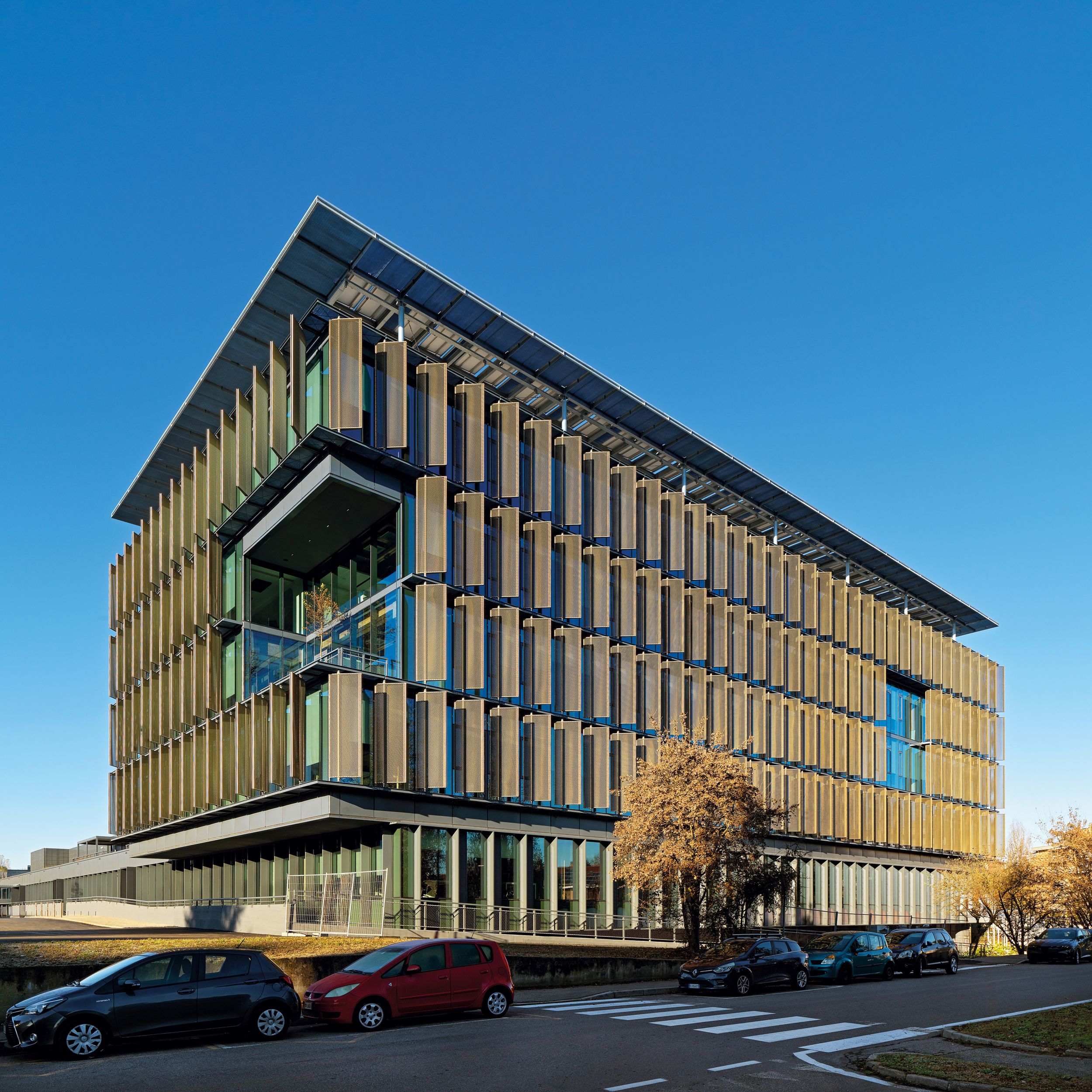 L’attuale carattere commerciale dell’edificio è stato parzialmente preservato attraverso il mantenimento di alcuni servizi come la banca e la farmacia. Sono stati inoltre introdotti un auditorium, un ristorante, uno spazio wellness e una caffetteria aziendale nella zona semipubblica dell’edificio, direttamente all’ingresso della piastra. Parte della struttura è coperta da terrazze verdi. Sul lato est del centro commerciale il manufatto esistente è stato demolito completamente ed è stato costruito un nuovo edificio di 6 piani fuori terra: una struttura ibrida in calcestruzzo armato (primo piano, core di distribuzione verticale) e in legno lamellare (strutture verticali dei pilastri e impalcati).