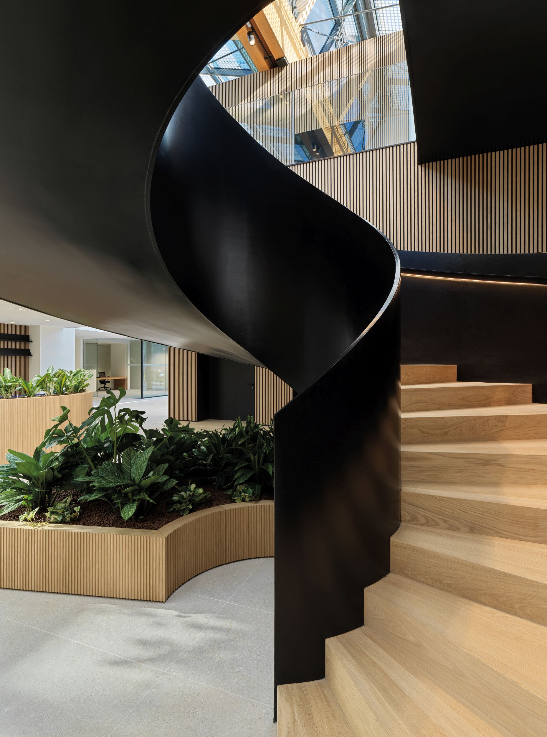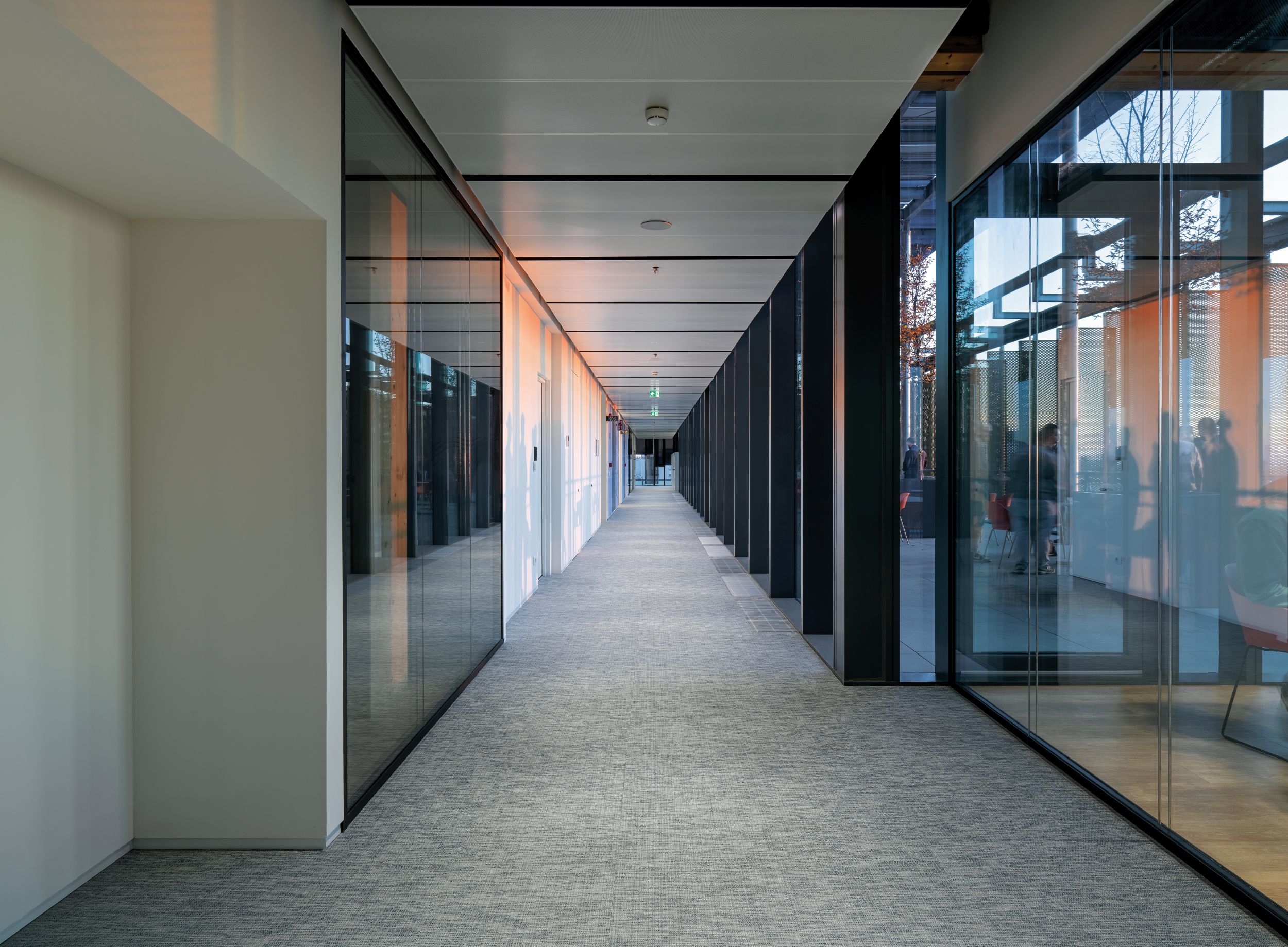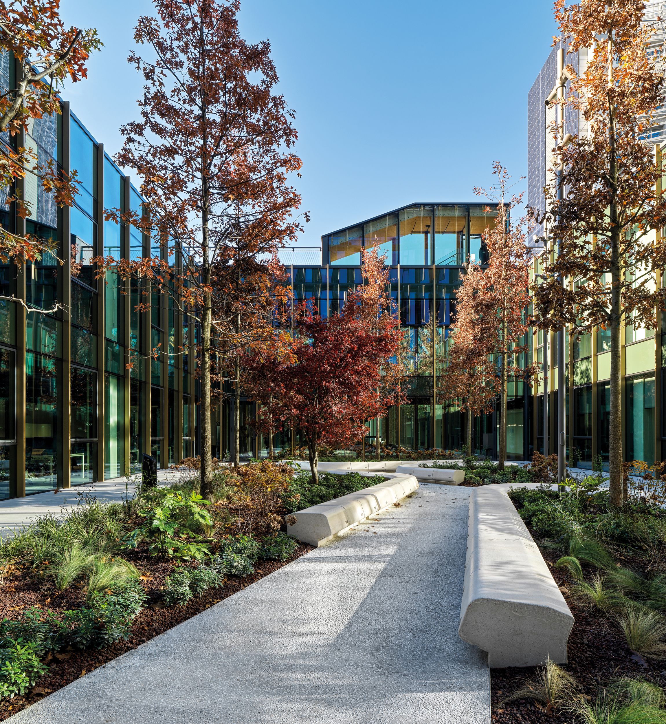 L’attuale carattere commerciale dell’edificio è stato parzialmente preservato attraverso il mantenimento di alcuni servizi come la banca e la farmacia. Sono stati inoltre introdotti un auditorium, un ristorante, uno spazio wellness e una caffetteria aziendale nella zona semipubblica dell’edificio, direttamente all’ingresso della piastra. Parte della struttura è coperta da terrazze verdi. Sul lato est del centro commerciale il manufatto esistente è stato demolito completamente ed è stato costruito un nuovo edificio di 6 piani fuori terra: una struttura ibrida in calcestruzzo armato (primo piano, core di distribuzione verticale) e in legno lamellare (strutture verticali dei pilastri e impalcati).