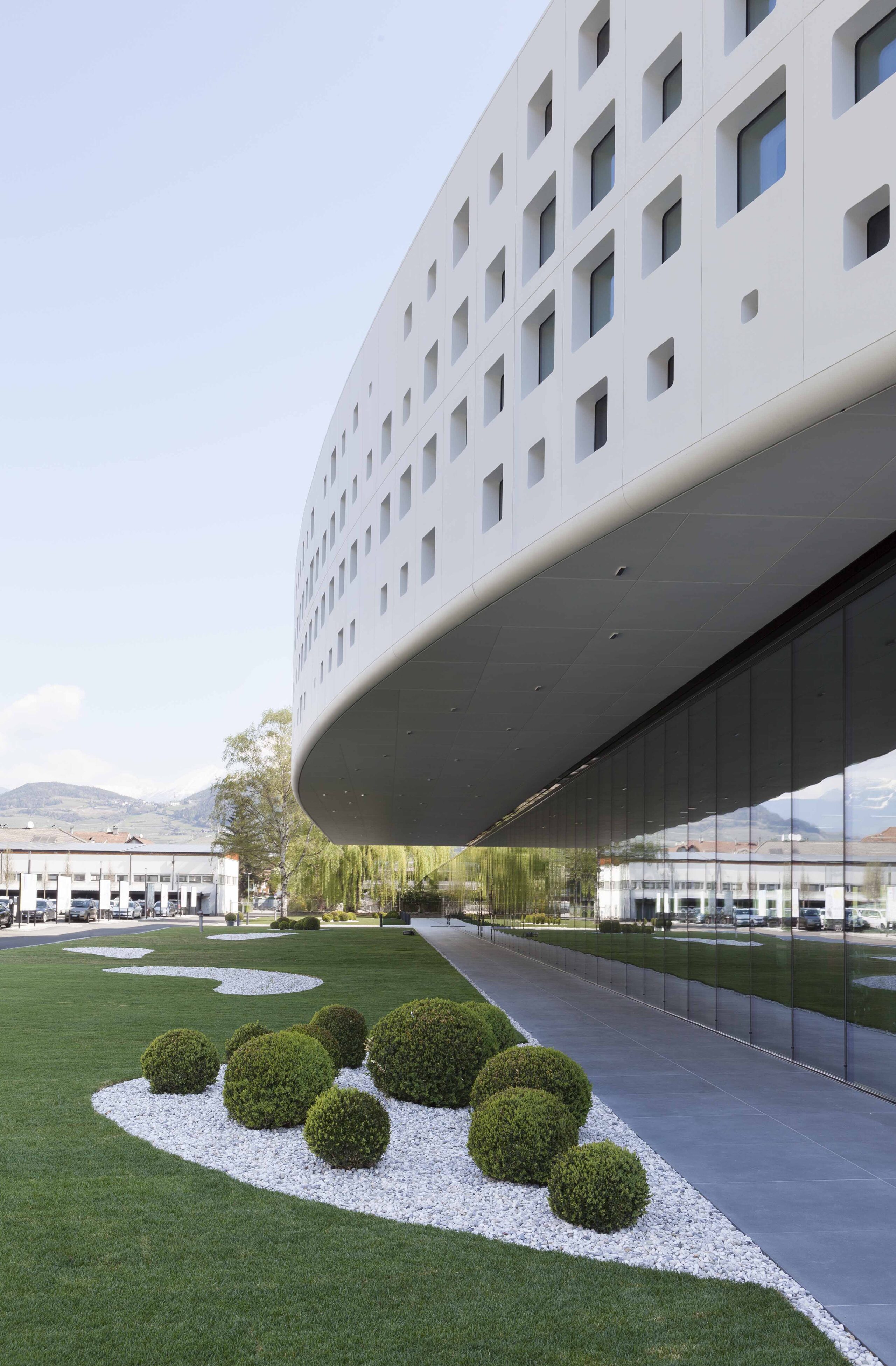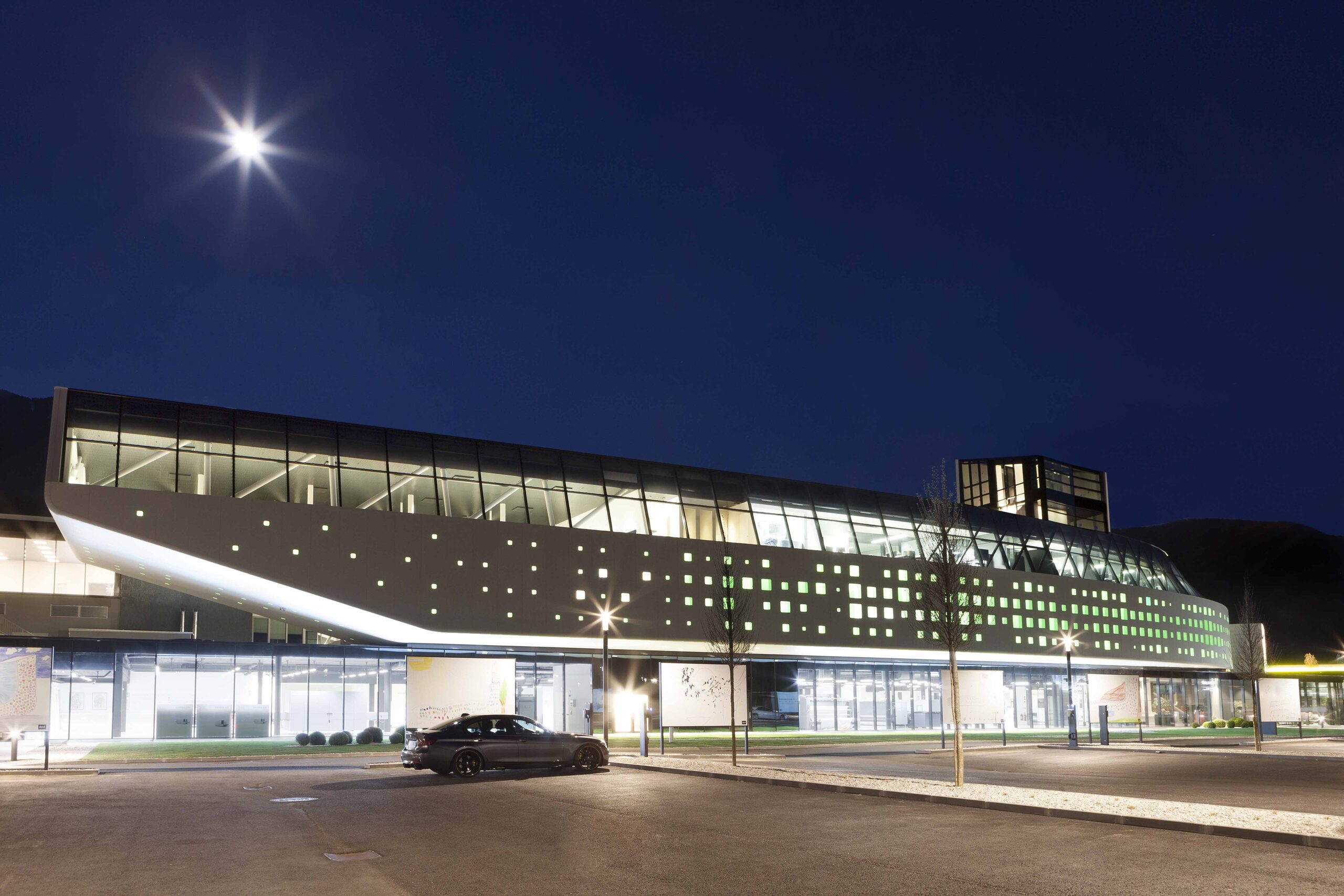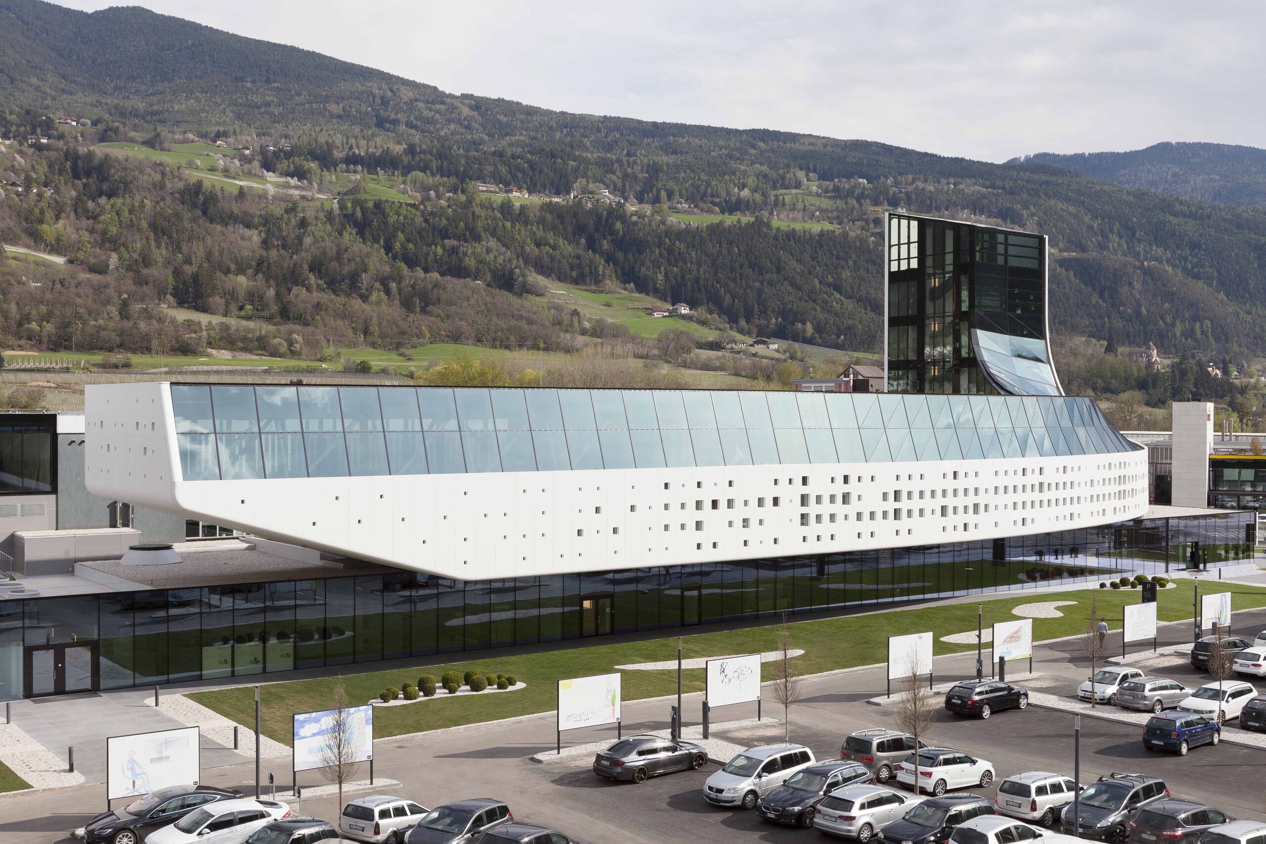 Un'ala galleggiante e una torre di sei piani con un'altezza di 35 metri sono diventati un elemento architettonico distintivo ben visibile nella zona industriale di Bressanone, mentre il design a pixel della facciata conferisce all’edificio una forte impronta identitaria. La facciata metallica esterna di 2.350 m² in lamiera di alluminio verniciata a polvere è dotata di elementi a finestra di varie dimensioni, illuminati con 850 LED. Tale illuminazione sottolinea e mette sapientemente in luce la dinamica della facciata a pixel. Fautrice di progettazione, realizzazione e montaggio di questo straordinario involucro è stata l’azienda Frener & Reifer srl. LignoAlp ha realizzato la sottostruttura in legno lamellare a strati incrociati per il fissaggio della facciata metallica.